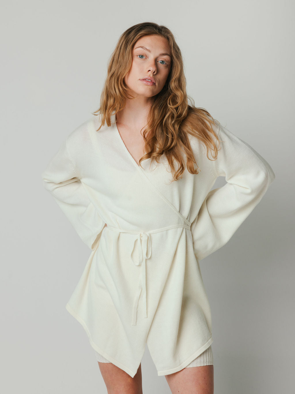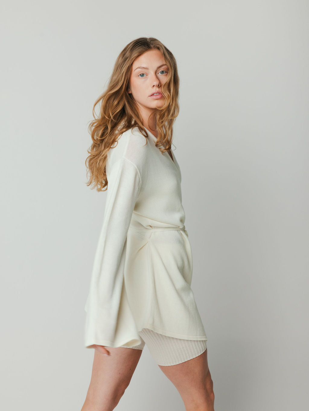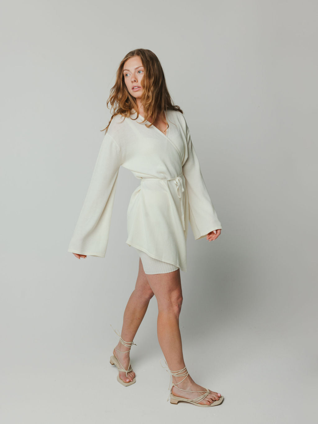 Mini wrap dress in merino wool with tie around waist and subtle bell sleeve.
