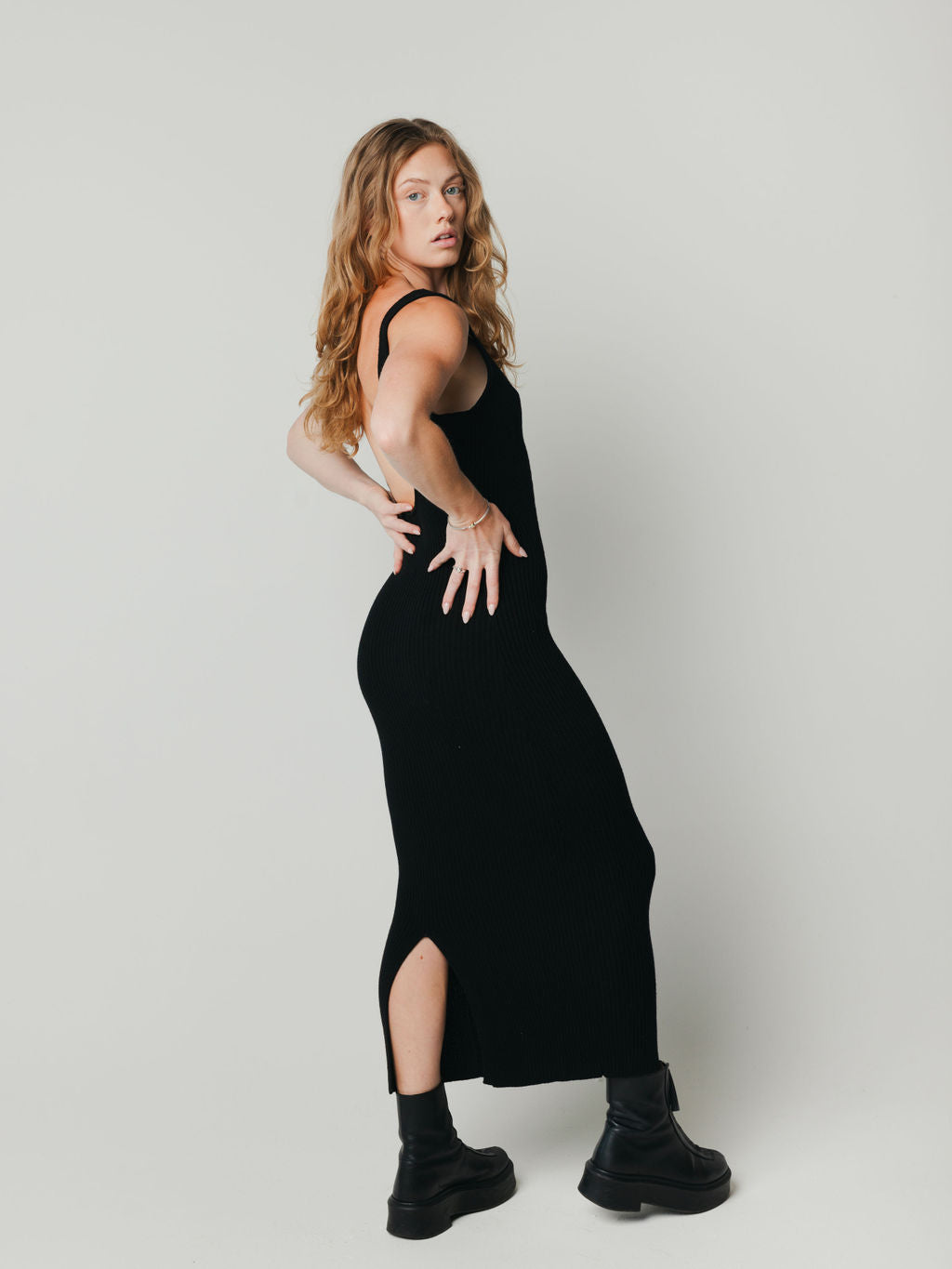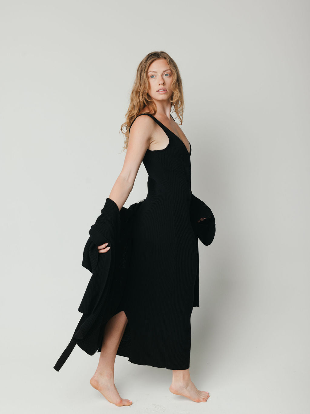 Mid-length dress in merino wool with scooped back, sweetheart neckline, and seashell ribbed bustier.